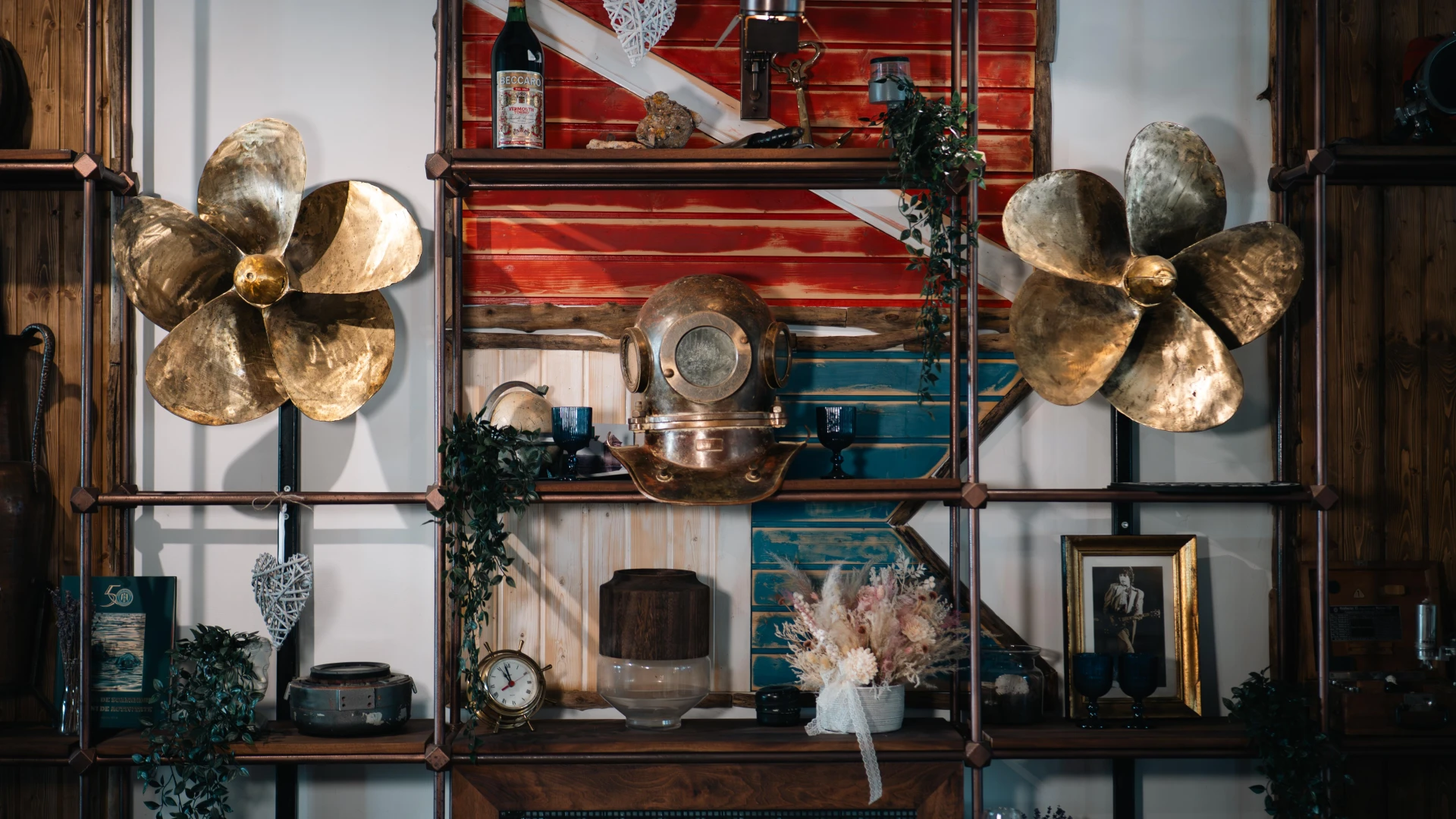 Aceste dozatoare de bere unice sunt realizate din autentice căști de scafandru greu americane, transformând o piesă de echipament subacvatic într-un element impresionant de design. Folosite inițial în scufundările comerciale, aceste căști din alamă au fost restaurate și integrate în barul Terasa cu Ancore, oferind o experiență unică pentru iubitorii de bere. Un simbol al pasiunii pentru mare și al istoriei scufundărilor.
