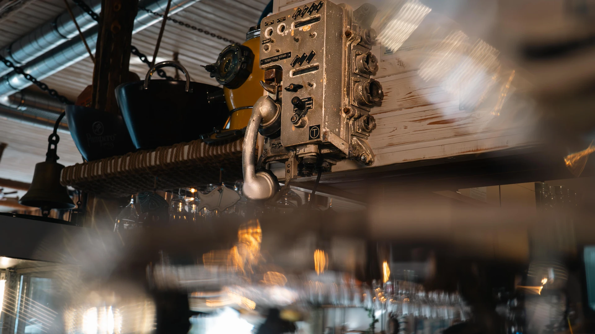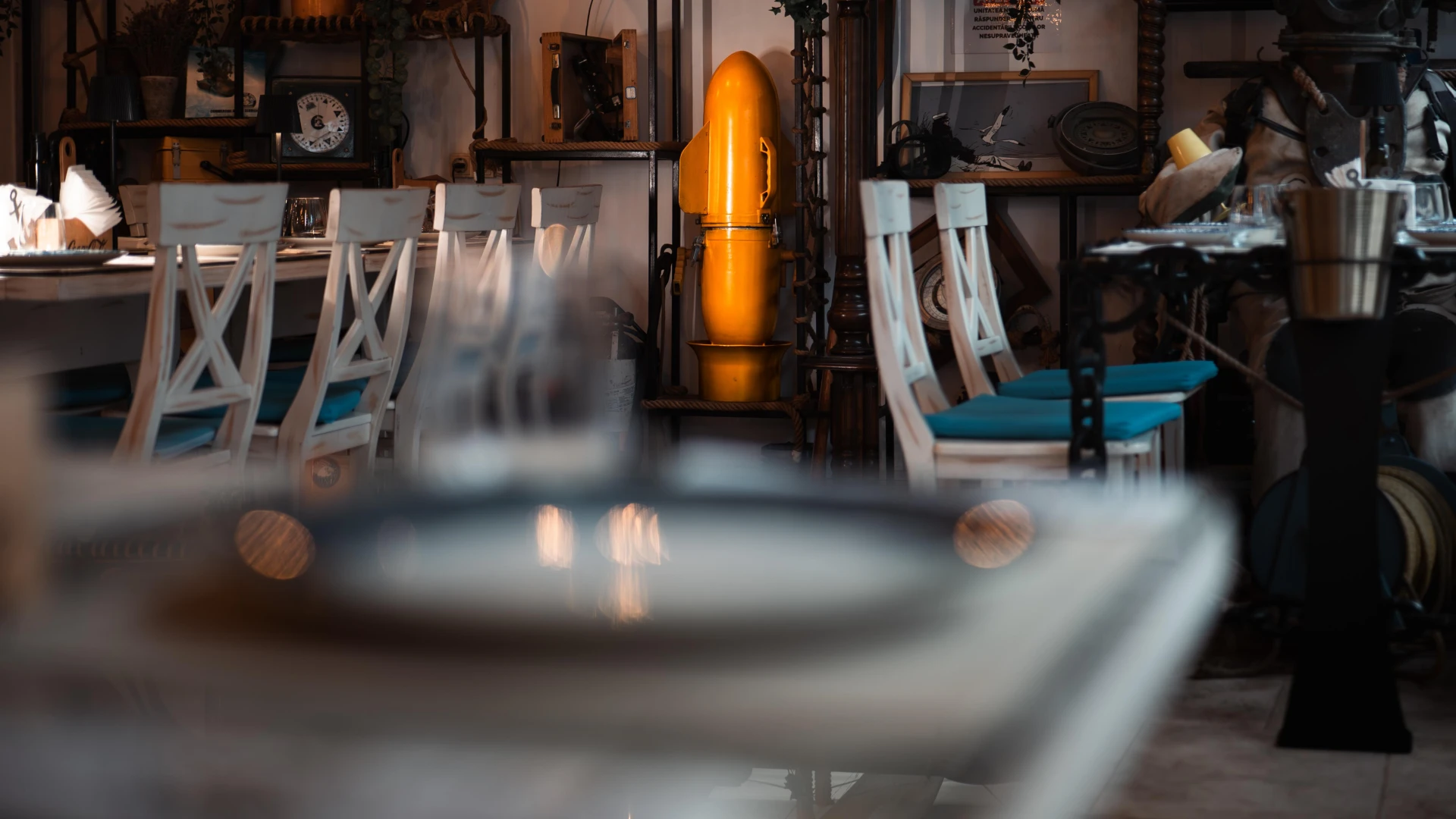 These authentic naval switches, once used on commercial ships, have been restored and repurposed for the Terasa cu Ancore bar. Fully functional and preserving their industrial aesthetic, these controls provide a tangible connection to maritime history. A unique detail that enhances the venue's nautical ambiance.