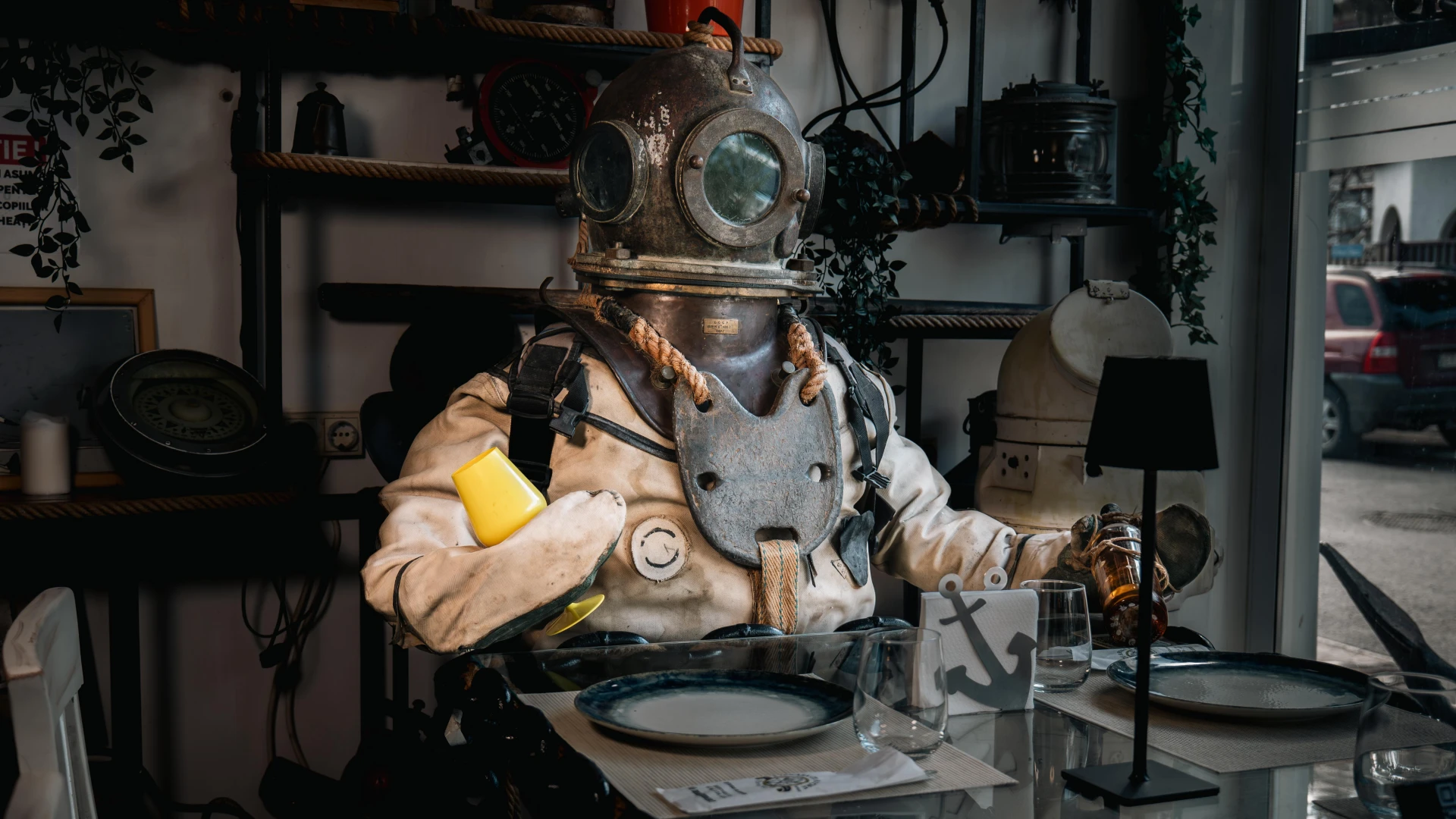This heavy diving helmet, painted in a distinctive yellow, was used by American divers for military and commercial underwater operations. Designed for enhanced safety and visibility, it represents a crucial part of deep-sea exploration history. Alongside it, a vintage naval clock, once used on ships to track maritime operations, adds a touch of authenticity to this historical maritime collection at Terasa cu Ancore.