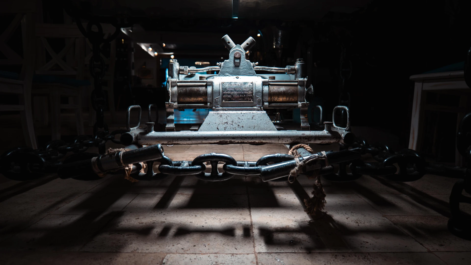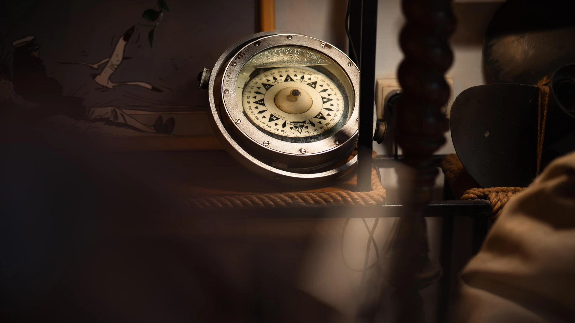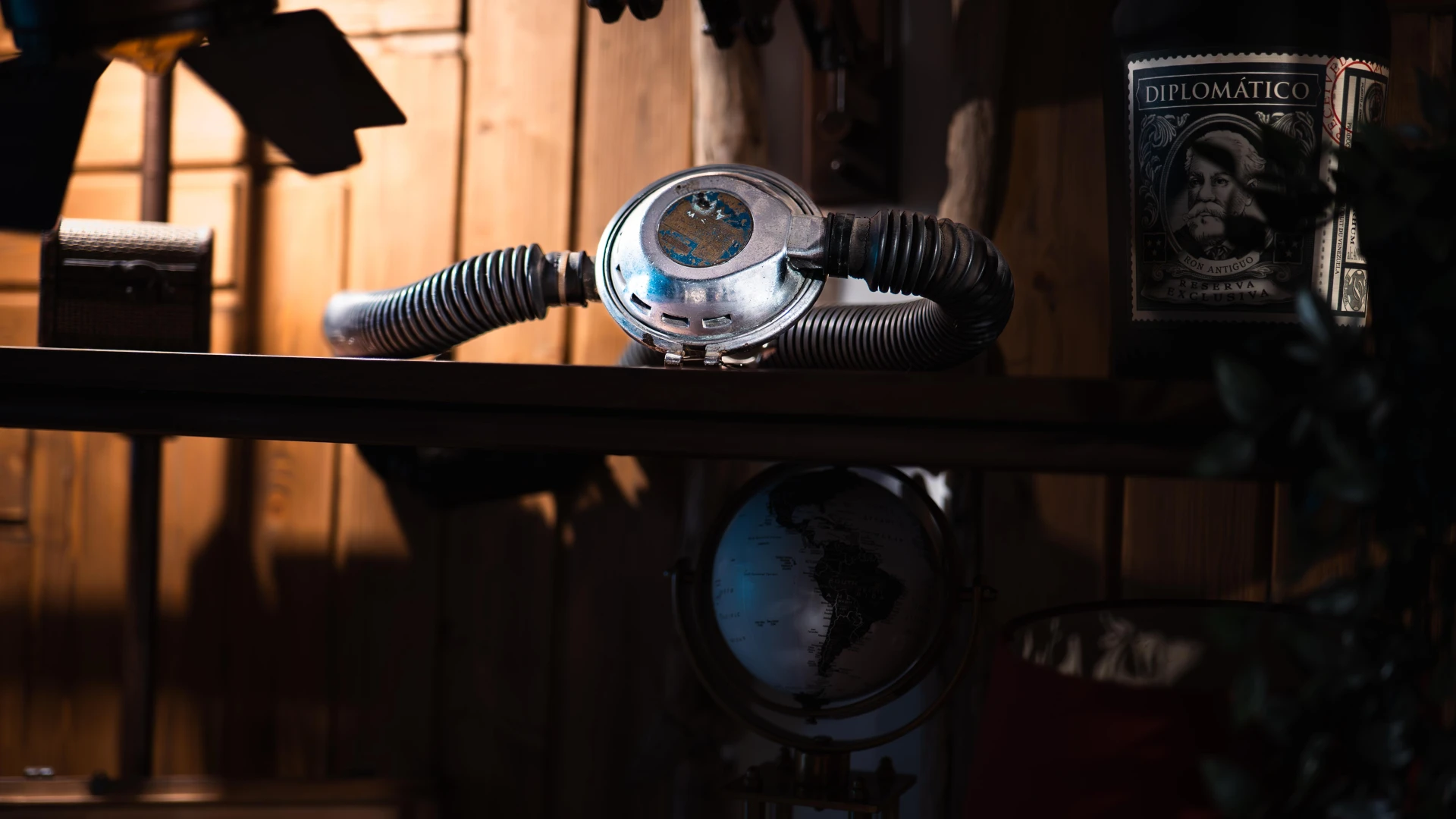 Această mască facială de scufundare, utilizată în operațiuni subacvatice profesionale, asigura respirația controlată și protecția scafandrilor în medii extreme. Dotată cu valve de reglare, permitea o gestionare optimă a fluxului de aer, esențială în misiuni tehnice subacvatice. Alături de ea, se află un indicator de poziție a cârmei, un instrument crucial pe nave comerciale, care ajuta echipajul să monitorizeze și să ajusteze direcția navei cu precizie maximă. Aceste obiecte rare, ce reflectă inovațiile maritime, sunt expuse la Terasa cu Ancore.