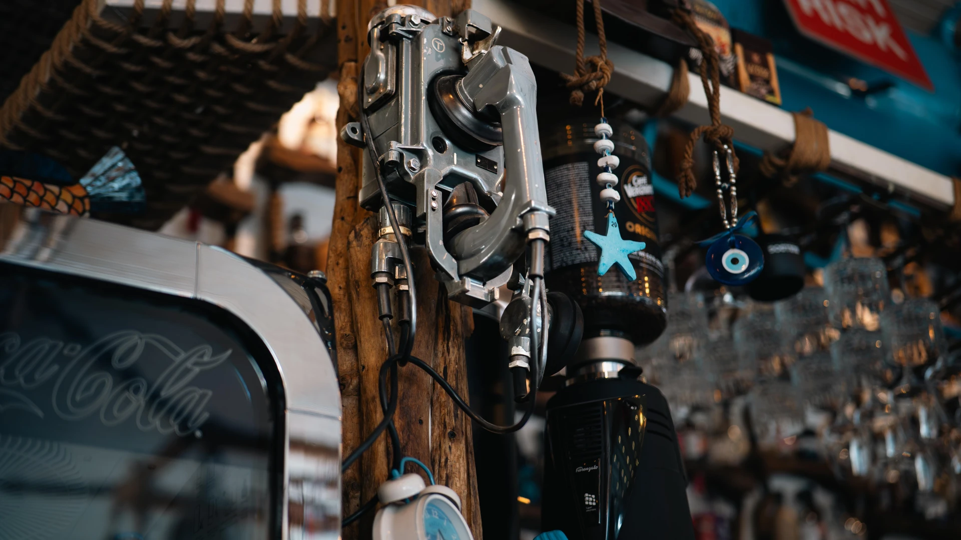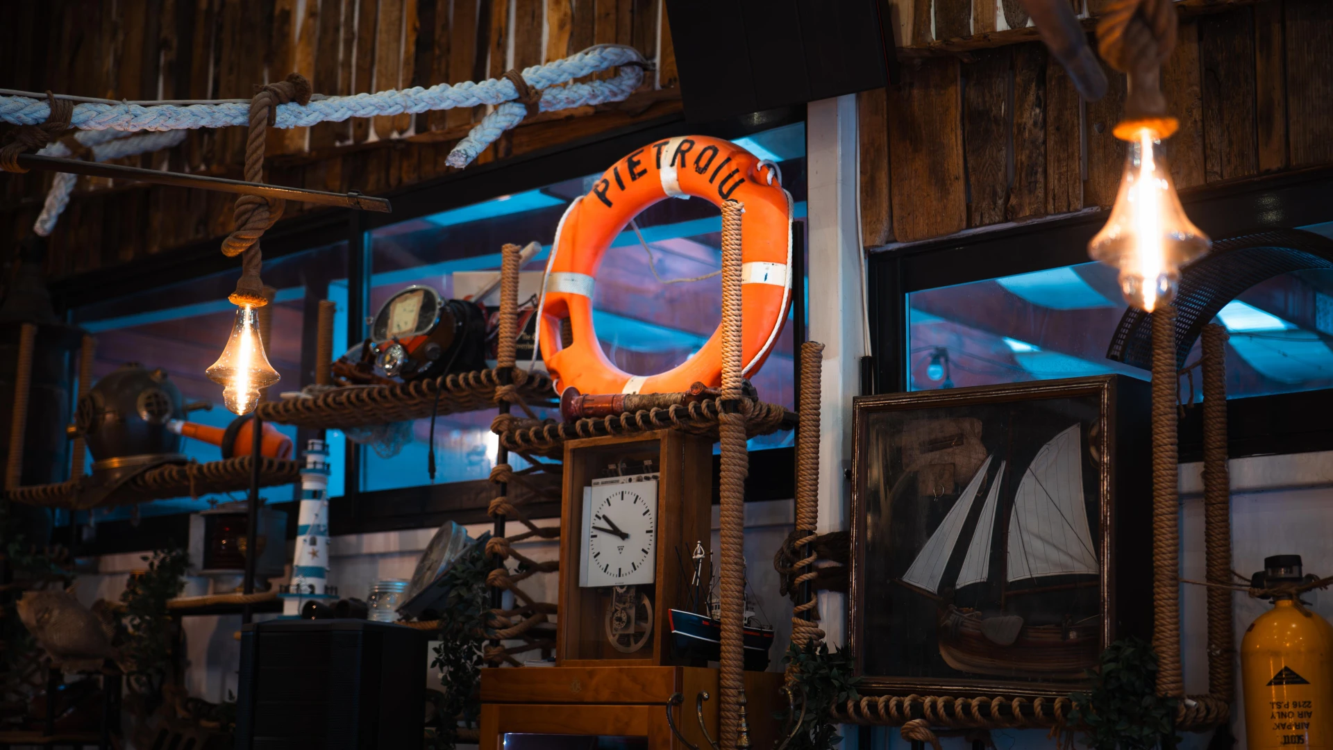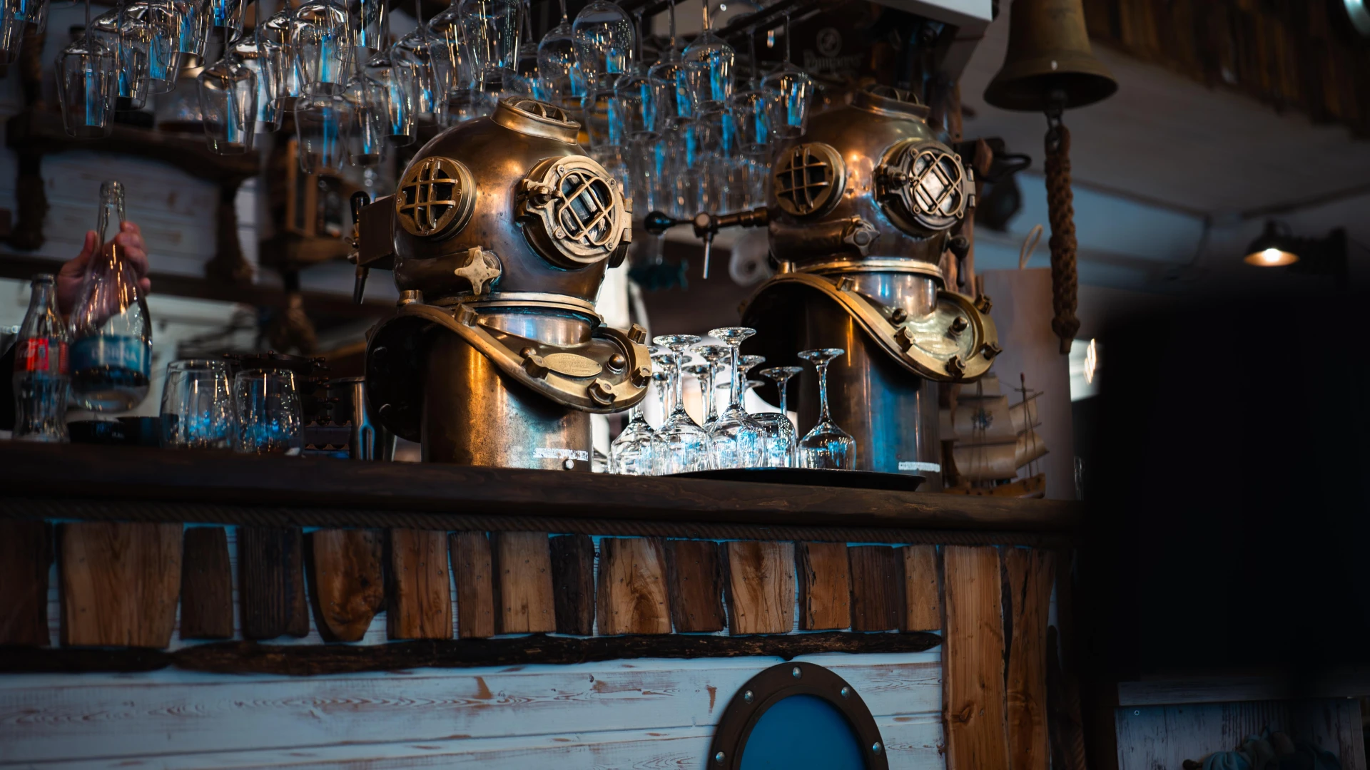 Aceste dozatoare de bere unice sunt realizate din autentice căști de scafandru greu americane, transformând o piesă de echipament subacvatic într-un element impresionant de design. Folosite inițial în scufundările comerciale, aceste căști din alamă au fost restaurate și integrate în barul Terasa cu Ancore, oferind o experiență unică pentru iubitorii de bere. Un simbol al pasiunii pentru mare și al istoriei scufundărilor.