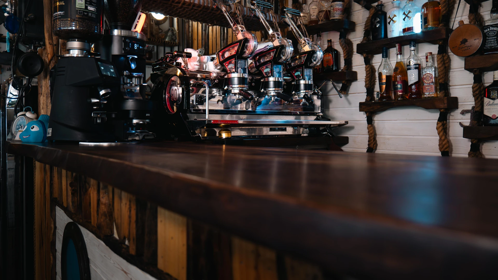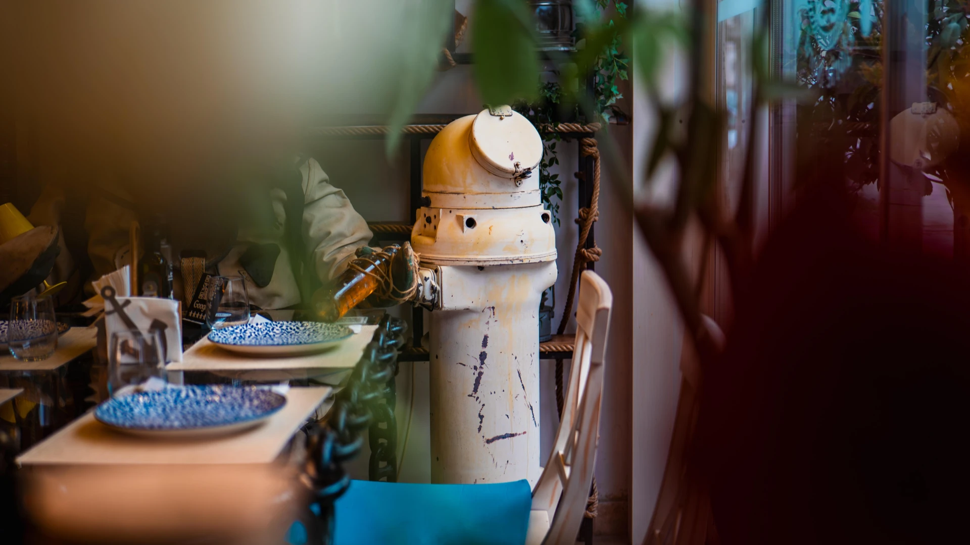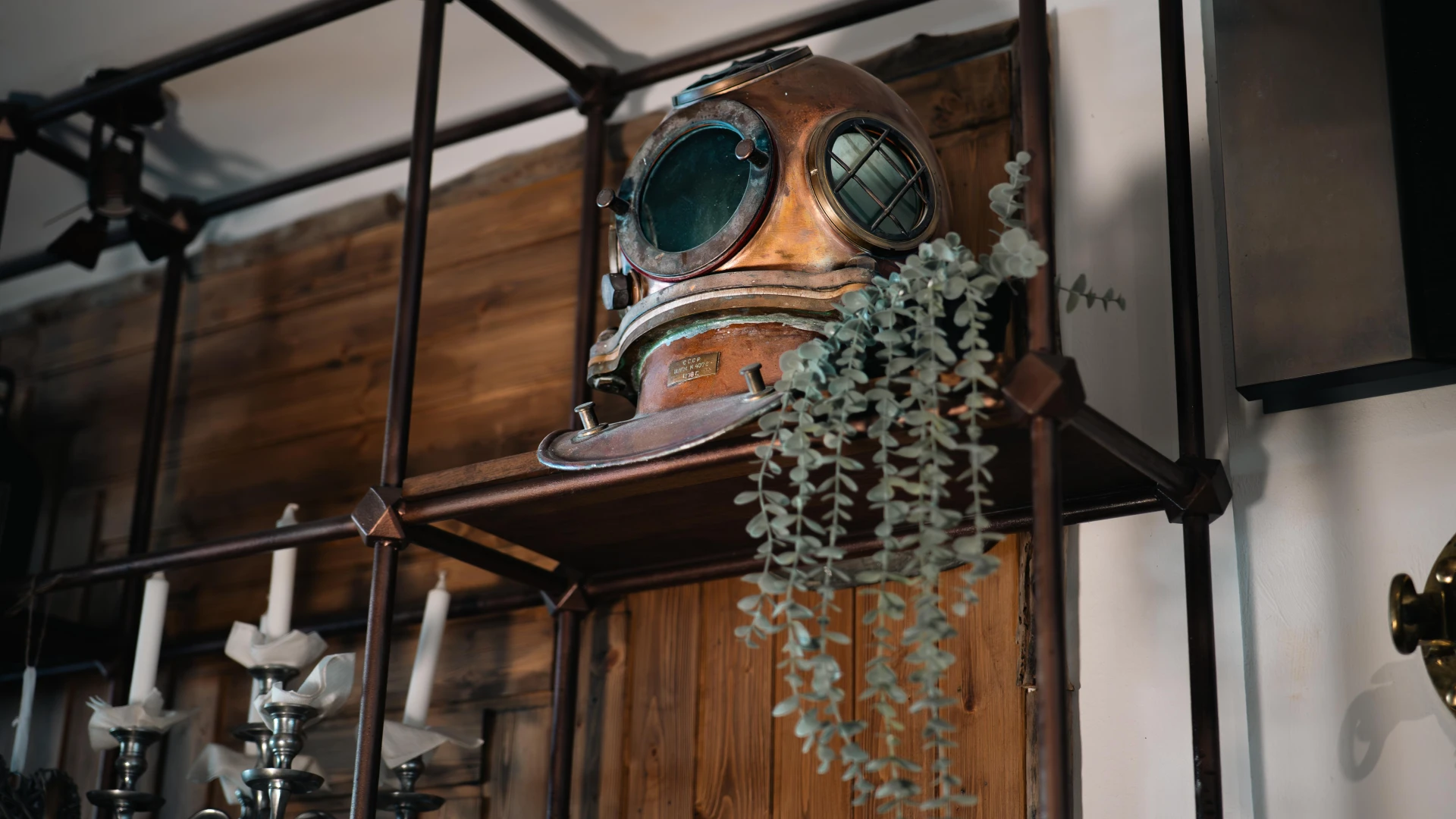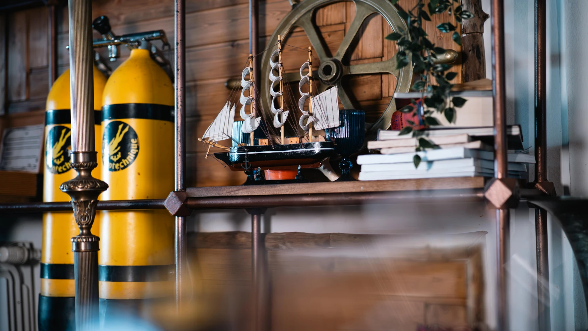 Aceste dozatoare de bere unice sunt realizate din autentice căști de scafandru greu americane, transformând o piesă de echipament subacvatic într-un element impresionant de design. Folosite inițial în scufundările comerciale, aceste căști din alamă au fost restaurate și integrate în barul Terasa cu Ancore, oferind o experiență unică pentru iubitorii de bere. Un simbol al pasiunii pentru mare și al istoriei scufundărilor.