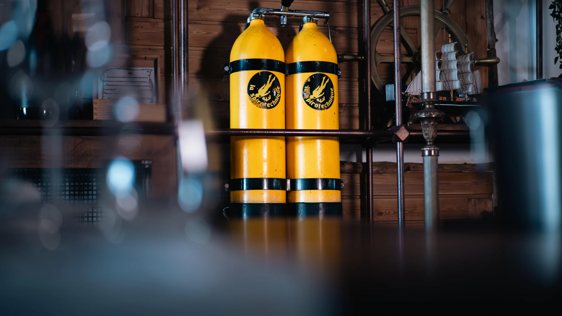 Această butelie dublă Spirotechnique, de origine franceză, este un model bi-bouteille, folosit în scufundările profesionale și militare. Concepută pentru fiabilitate și autonomie extinsă, permitea scafandrilor să opereze la adâncimi mari cu un flux optim de aer. Cu un design robust și un sistem de distribuție echilibrată, acest echipament a fost un standard în tehnologia scufundărilor. Simbol al inovației în domeniu, această piesă rară este acum expusă la Terasa cu Ancore.