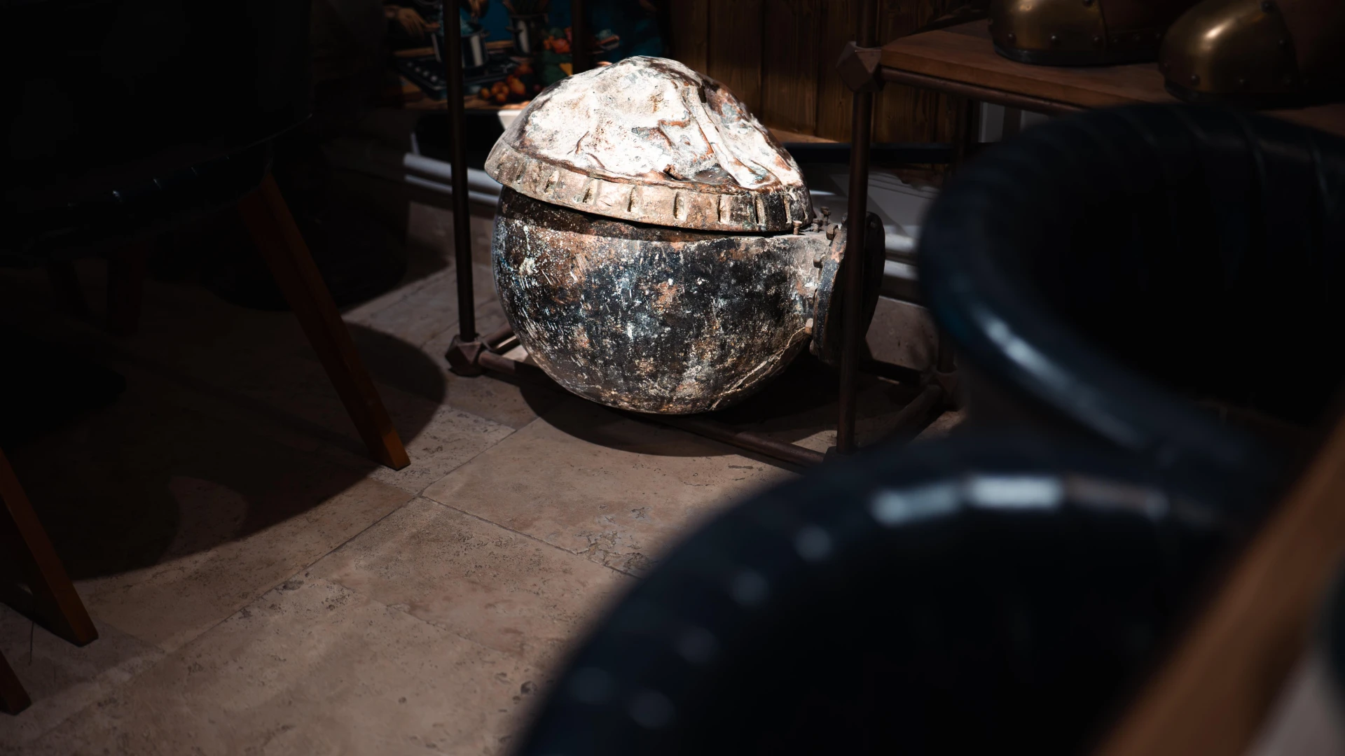 Această cască de scafandru greu MEDI, fabricată în Germania, este o piesă extrem de rară, existând doar 70 de exemplare în lume. Utilizată în scufundările industriale și militare, casca asigura siguranță și vizibilitate optimă la adâncimi mari. Construită din materiale robuste, reprezintă o capodoperă a ingineriei germane în domeniul scufundărilor. Acest artefact rar este acum expus la Terasa cu Ancore, oferind o privire asupra echipamentelor istorice de scufundare.