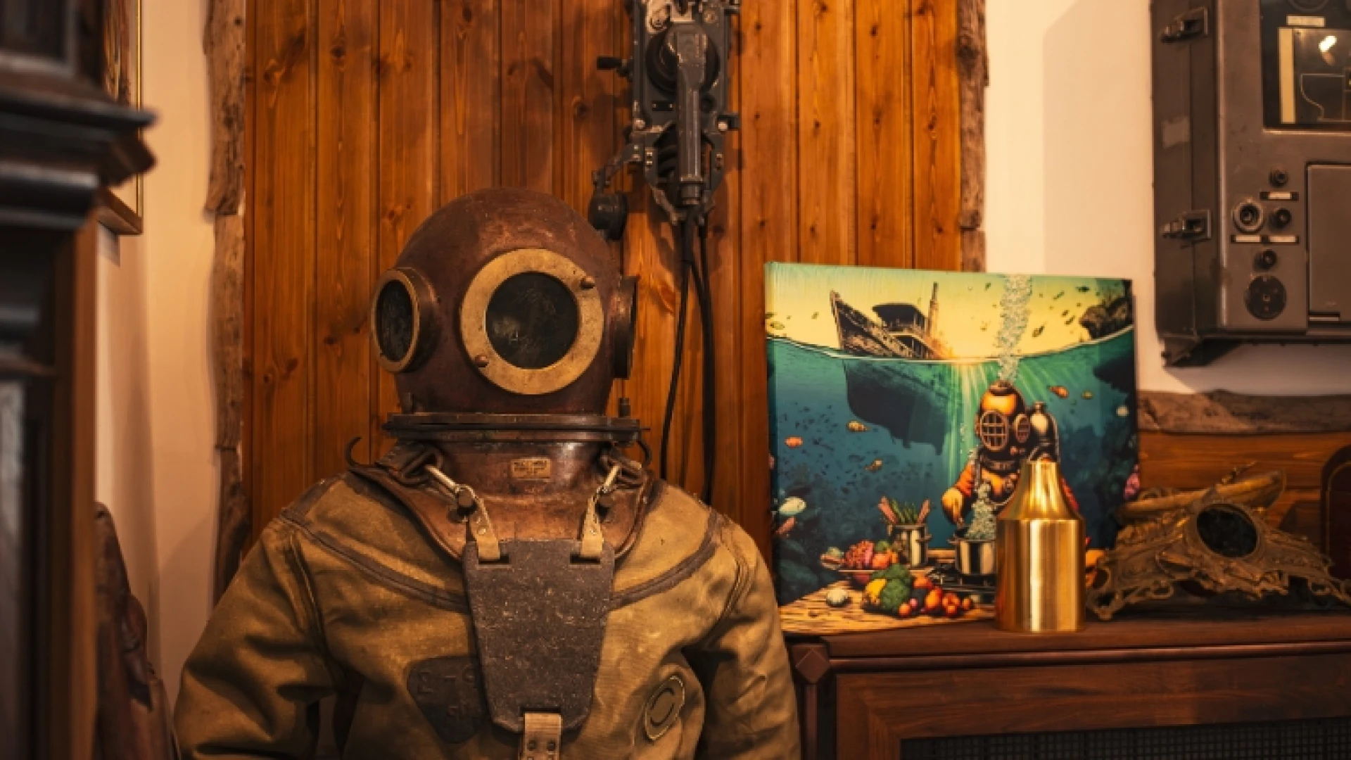 Ilie Jeciu, fost scafandru militar, actual scafandru comercial, a purtat dintotdeauna marea în suflet. Din dragostea pentru adâncuri și pentru lumea marină, acum mai bine de două decenii a început să colecționeze echipamente de scufundare și obiecte marinărești. Această pasiune nu a fost întâmplătoare: încă din tinerețe, visul lui a fost să creeze un loc special, unde poveștile nespuse ale adâncurilor să fie aduse aproape de oameni. Așa a luat naștere Terasa cu Ancore — locul unde fiecare colț respiră emoția unei vieți trăite sub apă și dragostea pentru mare.